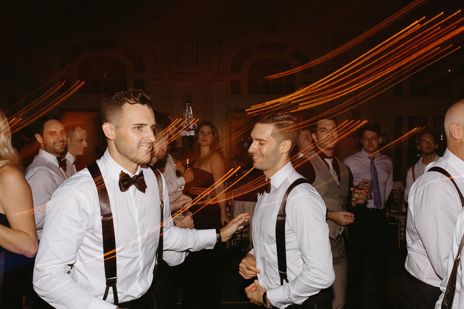 Their profound ceremony gave way to a ‘bopping’ reception for which they set the bar with a “mothers and sons dance.” “After our first dance (to “Green Eyes” by Coldplay) and the dance with each of our mother’s, we all four danced to the Scissor Sisters’ “Take Your Mama!” From there, having told their DJ/MC to turn their reception into a big party, “he kept the bops coming all night and the dancefloor stayed full!”