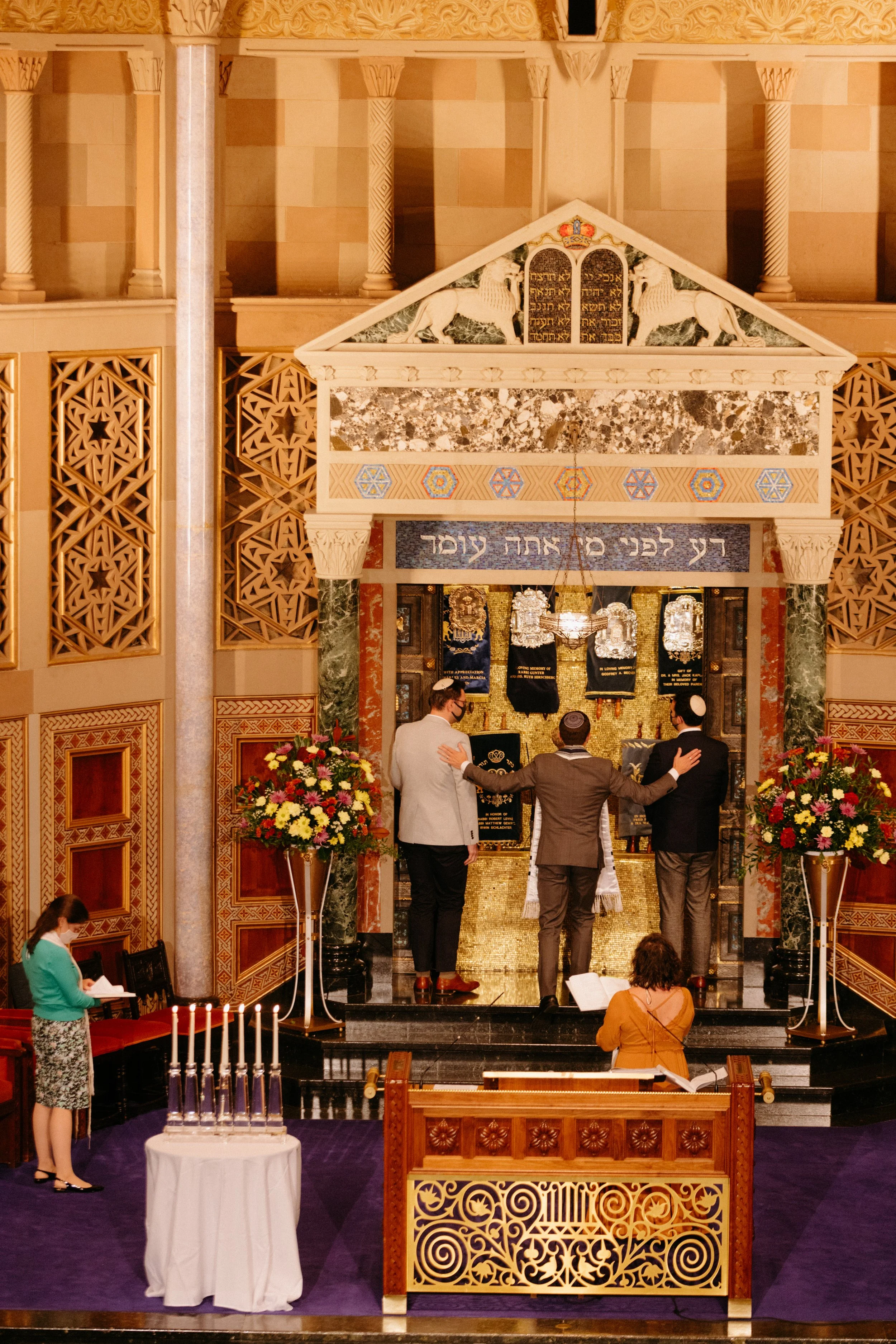Alex and John’s wedding was a squarely Jewish affair. Early in the day on Thursday, the couple went to the mikvah, a Jewish rite of purification involving prayer and submersion in water. In addition to this being a meaningful part of their Jewish wedding, John added: “It was the only time we were truly alone and away from the chaos!” Friday, in addition to the two running many last-minute errands, including a pant alteration for John, the couple, family and friends convened at Congregation Rodeph Sholom in the Upper West Side for Friday night Shabbat services, including the aufruf. The aufruf is when they call the to-be-married couple to the bimah (Jewish altar) to bless them in front of the synagogue’s community. John, as a convert to Judaism, didn’t grow up with the level of understanding and welcome that is typical among the progressive Jewish community. “Here I was, a gay man, with my soon-to-be husband, about to be blessed by this congregation… it was a very powerful moment.” Alex, having grown up at Rodeph Sholom, appreciated being called up for yet another lifecycle event as part of this Jewish community.