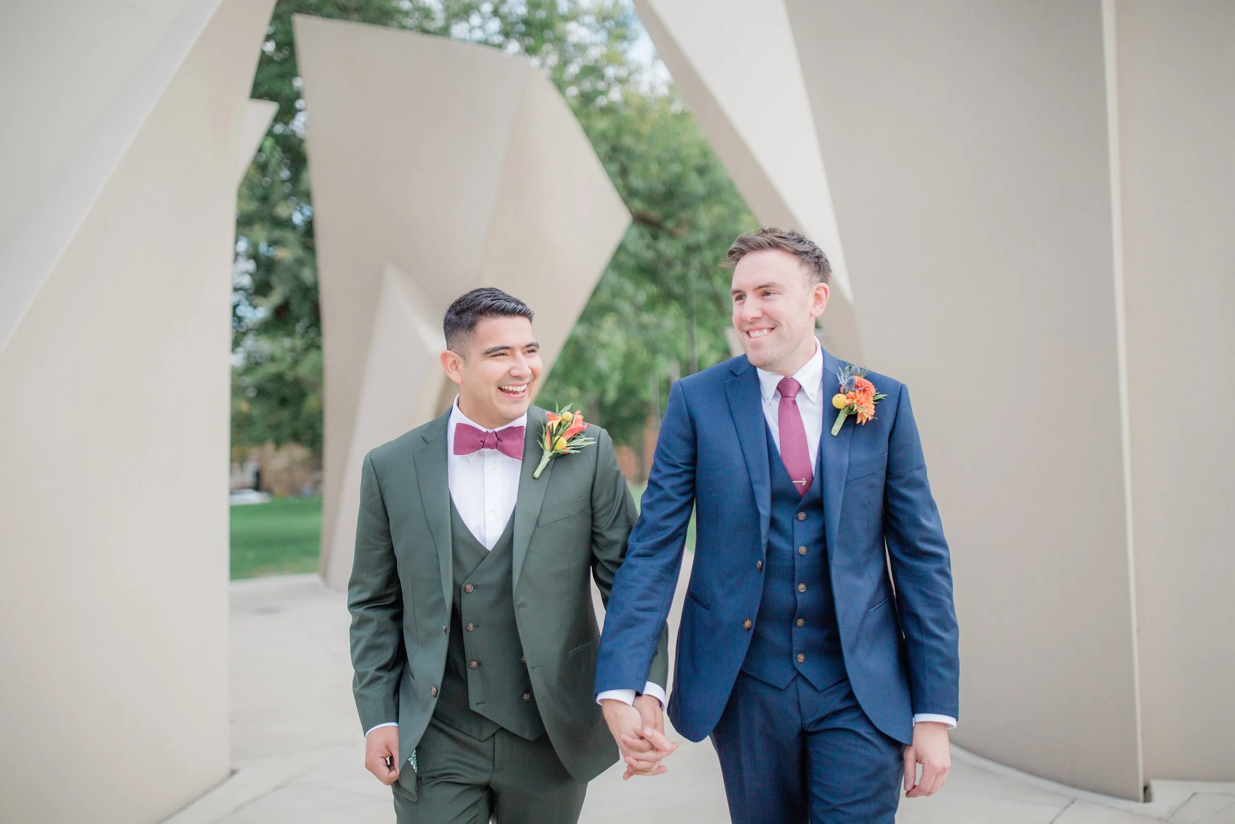 Hanging out led to weekends away together which led to their intended engagement weekend in the Smokey Mountain National Park in 2020. As you can imagine, this was scuttled thanks to, well… you know. “We had our rings we’d had made by a Cleveland jeweler ready, but had to cancel and simply waited to reschedule.” But, as the reschedule kept getting delayed, Edward popped the question at home, after dinner, as David was doing the dishes! They celebrated the news with their “plant babies” and along with them announced their engagement to friends and family. They eventually hosted a proper engagement shoot at the Cleveland Botanical Garden.