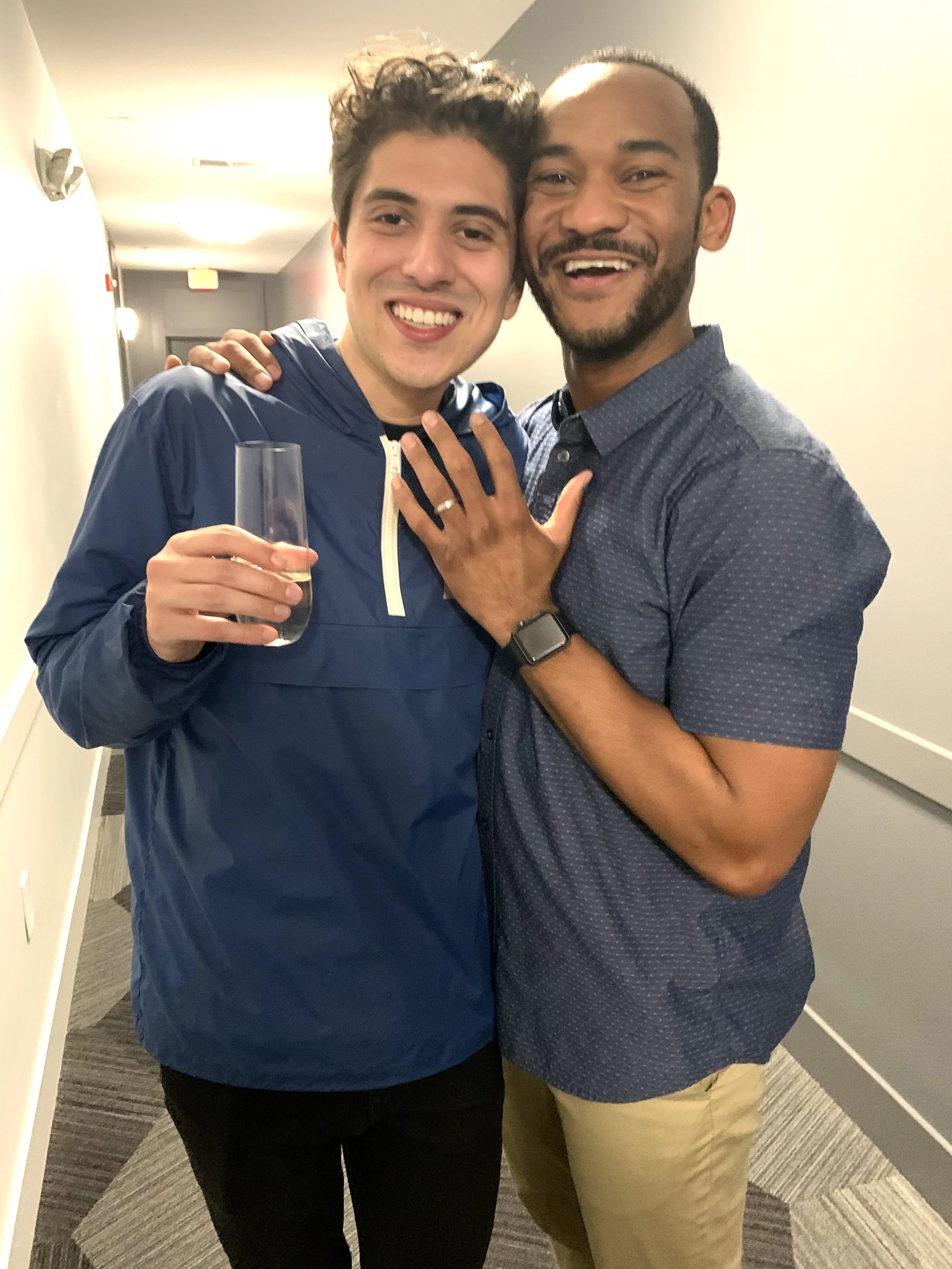 “We told each other that we loved each other for the first time after 6-months of knowing each other. Gabriel was still in the closet so known of his friends and family knew about us, but he allowed me to tell mine. At one year of knowing each other, the pandemic was just getting started and because of the population I worked with at the time, I had to isolate from everyone, including Gabriel. We saw each other on FaceTime and even had some very socially-distanced interactions too. We knew pretty instantly that being apart in this way was never going to work for us, so we risked what felt like a lot at the time and shared each others' air and germs. In July of 2020, I somewhat in jest mentioned marriage for the first time and without hesitation, Gabriel said, "well of course, we're going to get married." 8-months later, we were engaged.
